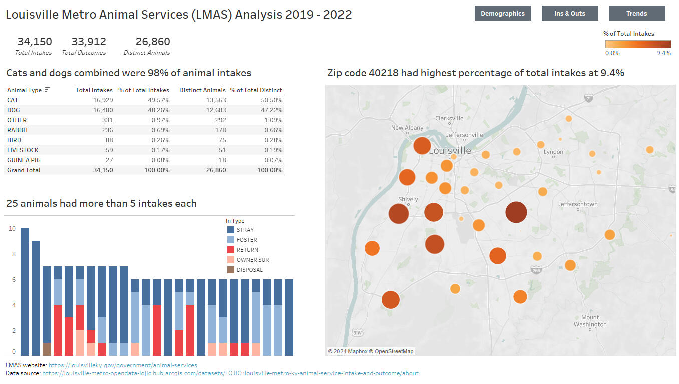 Business Case: Analyze historical data and create dashboards to help the animal shelter plan and use resources as well as identify opportunities to better serve their geographic area.Data Overview: Dataset from Louisville Metro Open Data website with 55,964 rows and 18 columns.Skills: Excel - data cleaning, pivot tables; Tableau - filtering, calculated fields, table calculations, dashboards with bar/column charts, line charts, map, treemap.