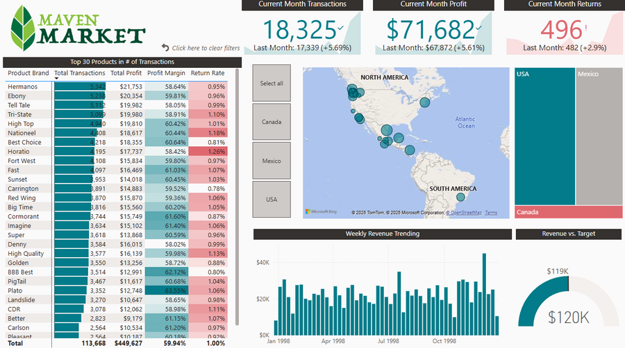Business Case: Create an interactive dashboard to track sales KPIs and trends for a multinational grocery store chain.Data Overview: 8 csv files of raw data including transactions (2 files), returns, products, customers, stores, regions, and a calendar.Skills: Power Query, data transformation, data modeling, calculated columns, DAX measures, KPI cards, column chart, matrix, gauge, treemap, map.