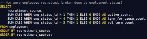 Business Case: Analyze employee data for insights and provide recommendations to Human Resources department.Data Overview: Dataset from Kaggle with 311 rows and 36 columns. Used Power Query to separate into 9 tables.Skills: SQL - multiple joins, CTEs, window functions, CASE WHEN statements, pivoting data, data manipulation; Excel - Power Query, pivot tables, data cleaning, data transformation, data modeling.